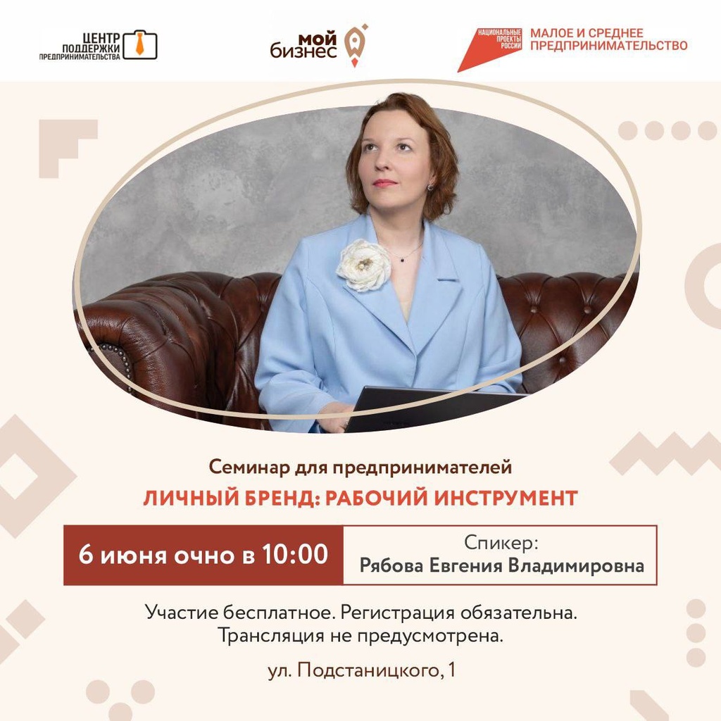 6 июня в Центре «Мой бизнес» (ул. Подстаницкого, д.1) состоится очный семинар «Личный бренд предпринимателя».