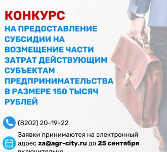 Дан старт конкурсу на предоставление субсидии на возмещение части затрат действующим субъектам предпринимательства в размере 150 тысяч рублей.