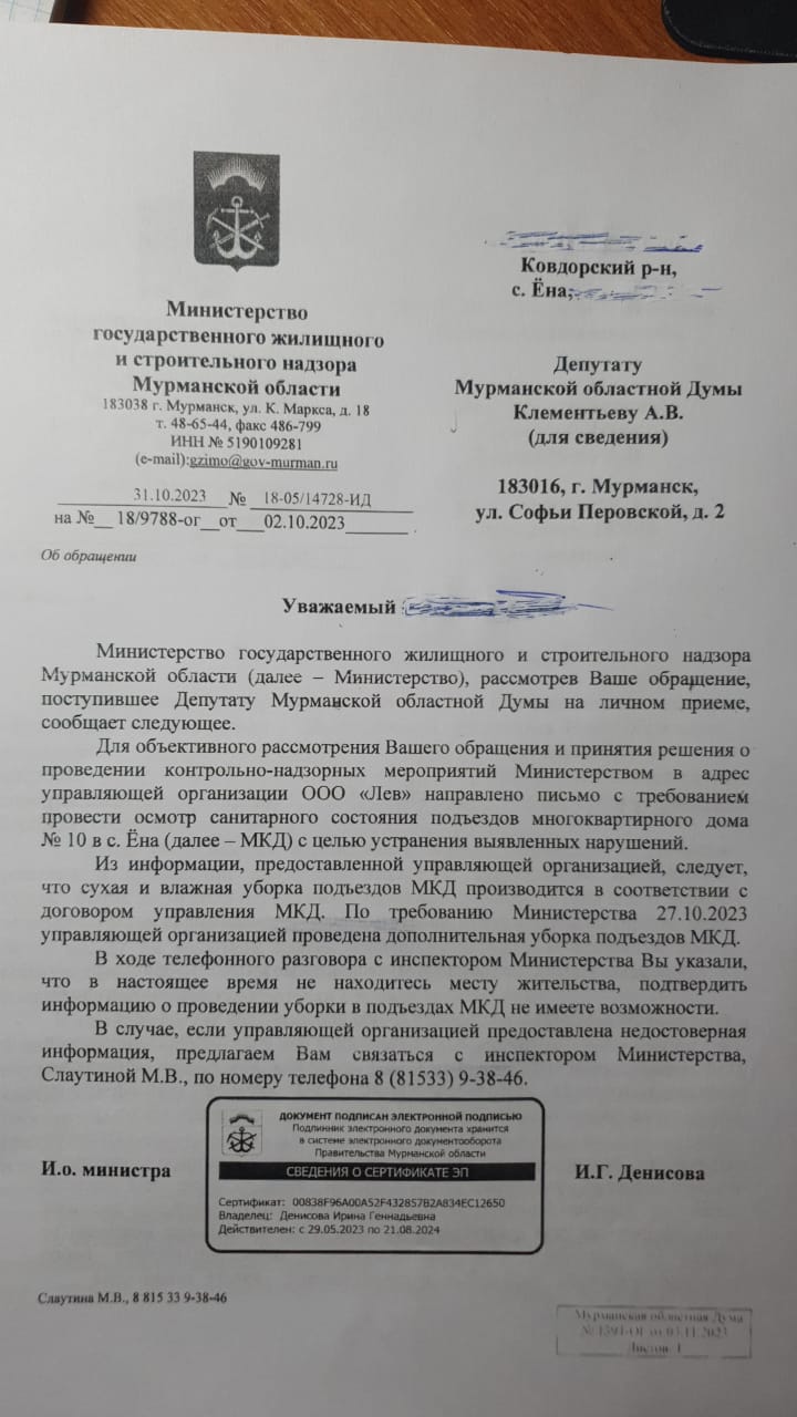 В сентябре 2023 года жительница села Ена пожаловалась депутату Александру Викторовичу Клементьеву на личном приеме на недостаточную санитарную уборку подъездов. Депутат направил запрос в Министерство государственного жилищного и строительного надзора.
