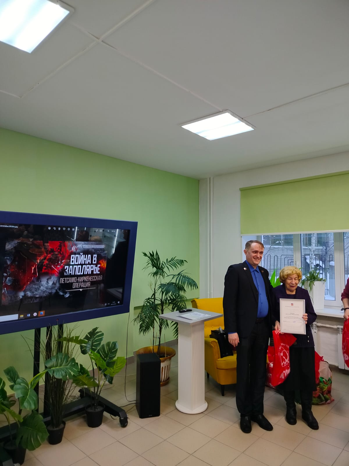 Участники мероприятия посмотрели документальные фильмы о боях в Советском Заполярье. Борис Павлович Крылов прочитал выдержки из "Василия Теркина", а Галина Алексеевна Халихвердиева - стихи собственного сочинения.
