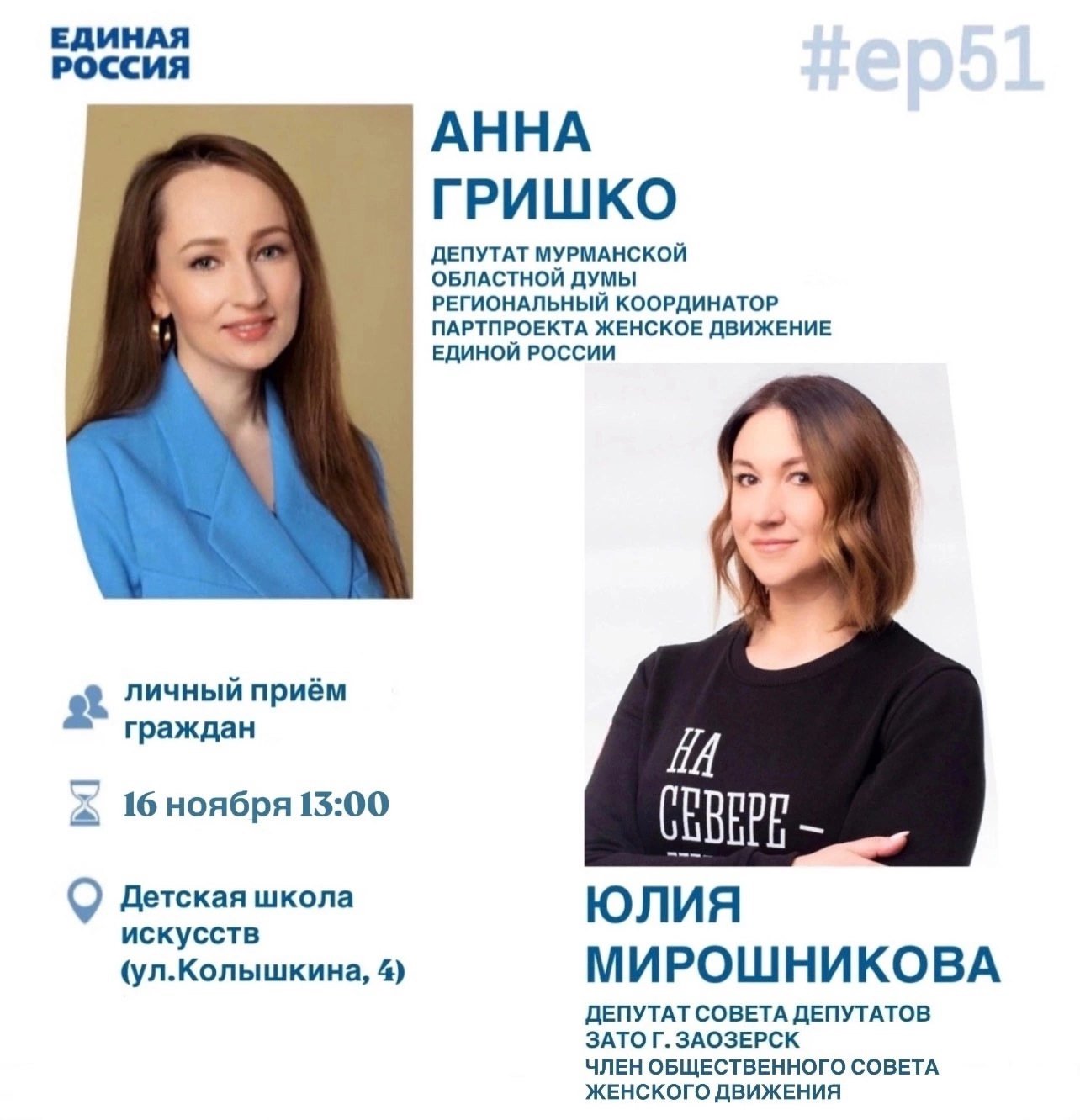 16 ноября в городе Заозерск состоится приём граждан, который будет проводиться совместно с членом Общественного совета партпроекта "Женское движение Единой России" в Мурманской области. Приём организует депутат Совета депутатов ЗАТО г. Заозерск Юлия Мирошникова.