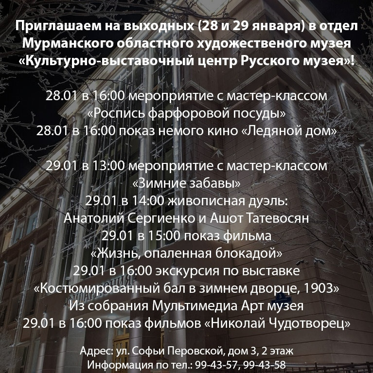 Мурманский областной художественный музей предлагает насыщенную программу мероприятий отдела музея «Культурно-выставочный центр Русского музея» (ул.