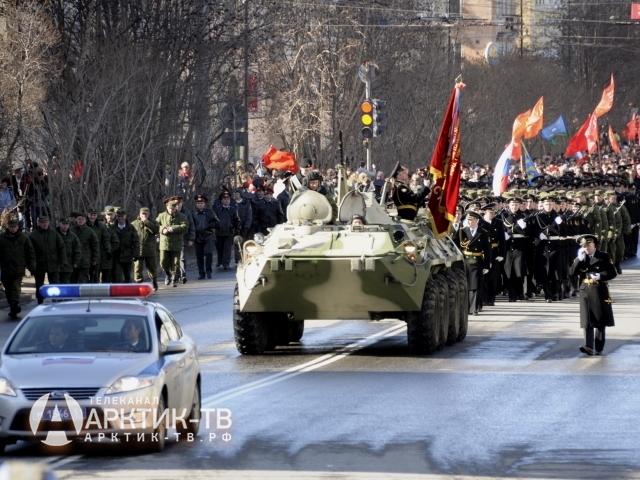 В составе механизированной колонны — береговые ракетные комплексы «Бал» и «Бастион», зенитные ракетные комплексы С-400 «Триумф», танки Т-80 БВМ, бронетранспортеры, арктическая техника и другие машины. Возглавит колонну легендарный танк Т-34, он провезёт по проспекту копию Знамени Победы, водруженного над поверженным Рейхстагом. Начало парада в 10.00.