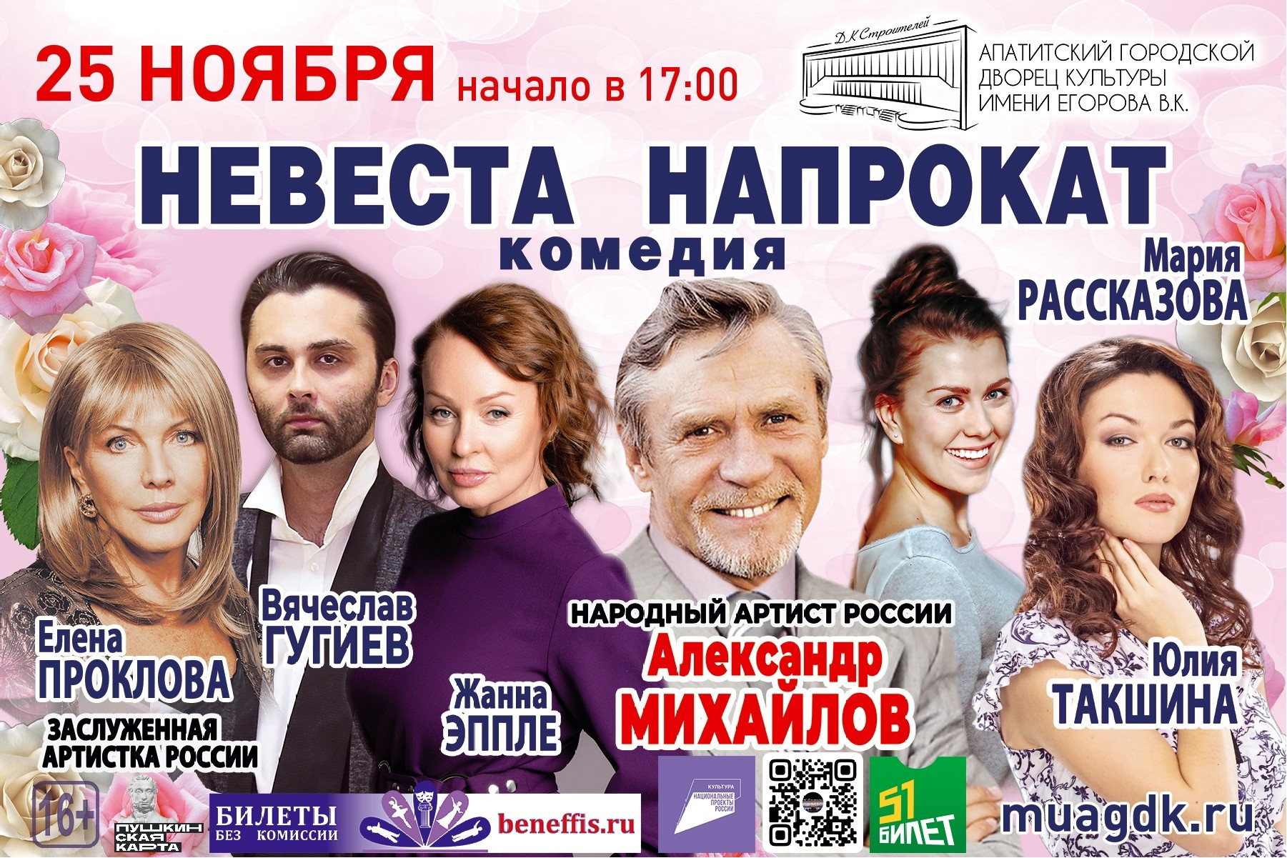 Спектакль «Невеста напрокат» от студии театральных технологий «Бенефис» будет представлен зрителям 25 ноября в 17:00 в зрительном зале Дворца культуры Апатитов. Эта комедия, пропитанная юмором и иронией, обещает оставить яркие впечатления. В спектакле принимают участие известные актеры театра и кино, такие как Александр Михайлов, Елена Проклова, Жанна Эппле, Юлия Такшина и другие.
