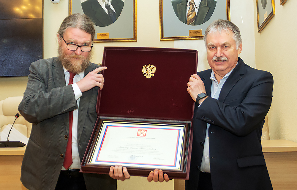 Этой грамотой награждают с 2008 года известных граждан России, которые внесли значительный вклад в реализацию государственной политики нашей страны. По поручению Администрации президента грамоту и серебряный нагрудный знак торжественно вручил Сергею Вячеславовичу генеральный директор Кольского научного центра, академик РАН Сергей Кривовичев.