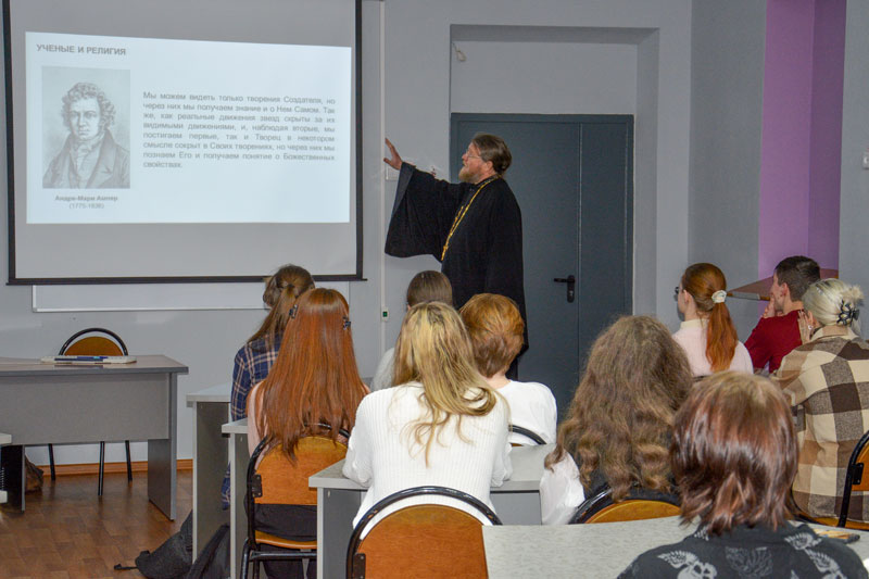 Священник рассказал о своем опыте работы в научной сфере, о роли науки и значении научных достижений в истории человечества, об открытиях выдающихся ученых прошлого. Размышляя над вопросом соотношения науки и религии, отец Сергий подчеркнул, что они не вступают в противоречие, а дополняют друг друга.