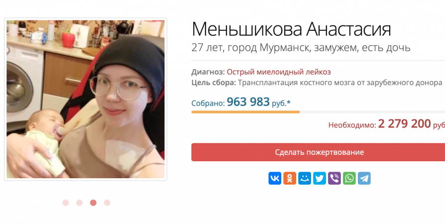Ознакомиться с актуальной суммой сбора и возможностью помочь молодой маме из Мурманска можно на сайте благотворительного фонда борьбы с лейкемией.