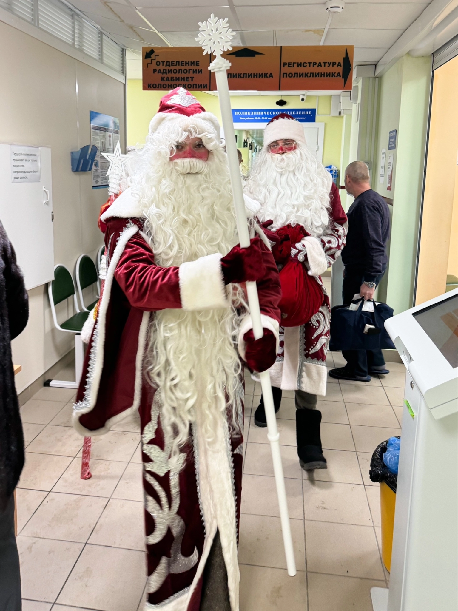 Три Дедушки Мороза прошли по коридорам диспансера, заглядывая в каждую палату, чтобы никто не остался без внимания, поздравили пациентов, пожелали им крепкого здоровья и быстрого выздоровления, подарили подарки.